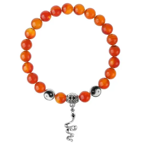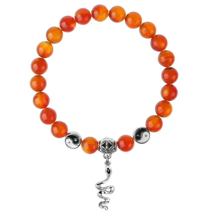 Браслет-амулет из натурального сердолика с подвеской в виде змеи из бижутерного сплава.