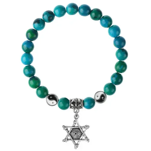 Браслет-амулет из синтетического камня Хризоколла с подвеской-талисманом из бижутерного сплава, покрытого под серебро. Этот уникальный аксессуар обладает культурным значением, символизируя защиту от негативных энергий и злых духов. Внутренний диаметр браслета составляет около 5,5 см, а диаметр каменных бусин — 8 мм.