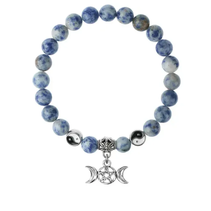 Браслет-амулет из натурального камня Содалит с подвеской-талисманом из бижутерного сплава, покрытого под серебро. Этот уникальный аксессуар не только привлекает внимание, но и наполнен глубоким символизмом. Внутренний диаметр браслета составляет около 5,5 см, а диаметр каменных бусин — 8 мм.