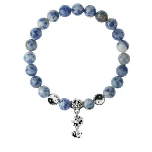 Браслет-амулет из натурального камня содалит с подвеской в виде кошки из бижутерного сплава.