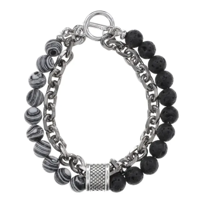 Браслет из бусин синтетического полосатого агата, натуральной лавы и металла с замком типа тогл.