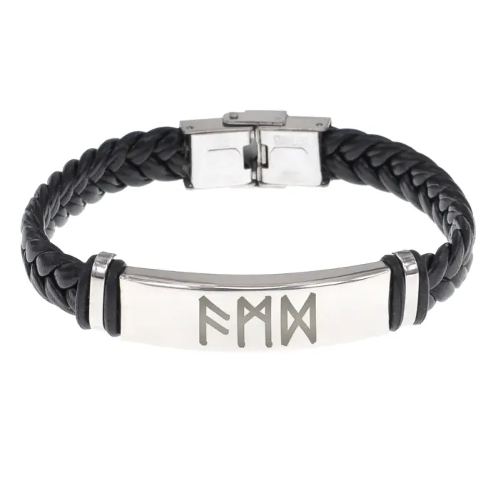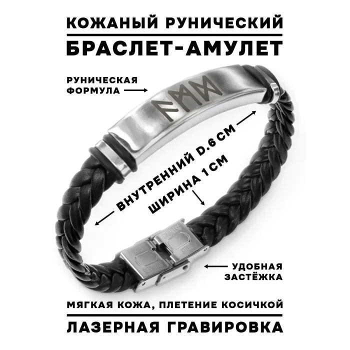 Кожаный браслет-оберег с плетёным дизайном и рунической символикой.