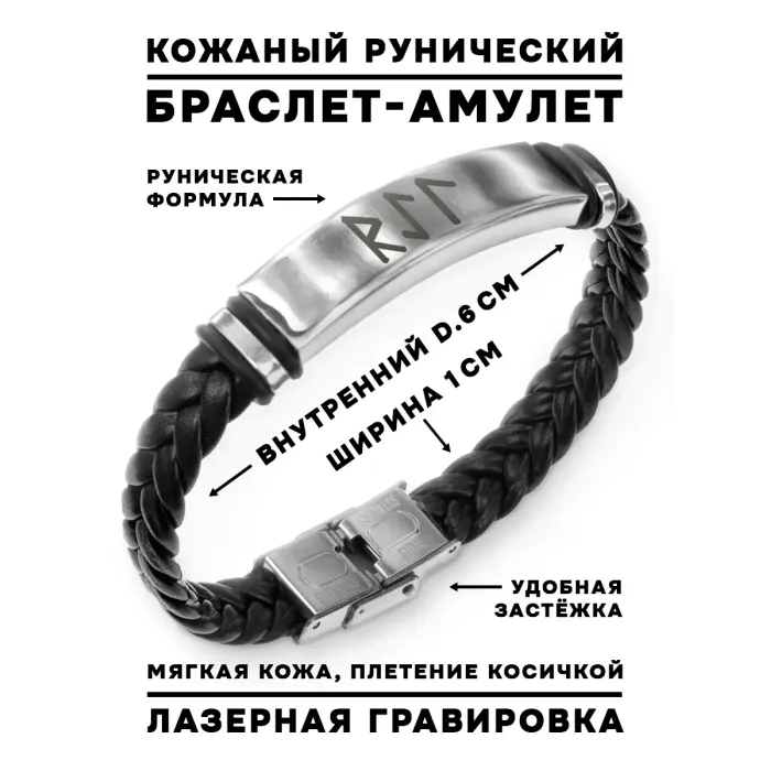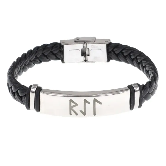 Кожаный рунический браслет с плетёной текстурой и символикой защиты в пути.