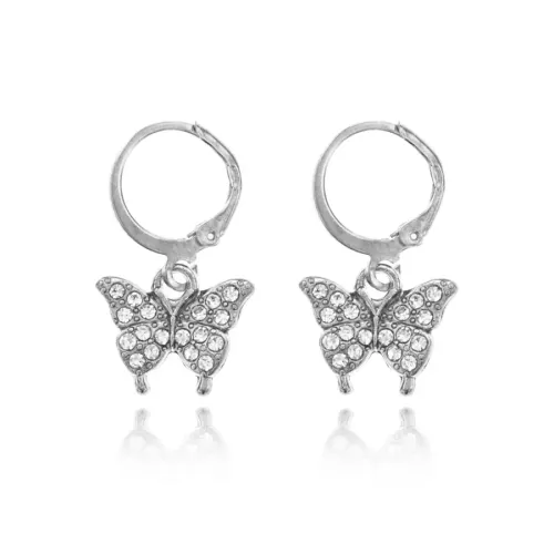 Серьги-сувенир в форме бабочки, выполненные из бижутерного сплава с серебряным покрытием и стразами.