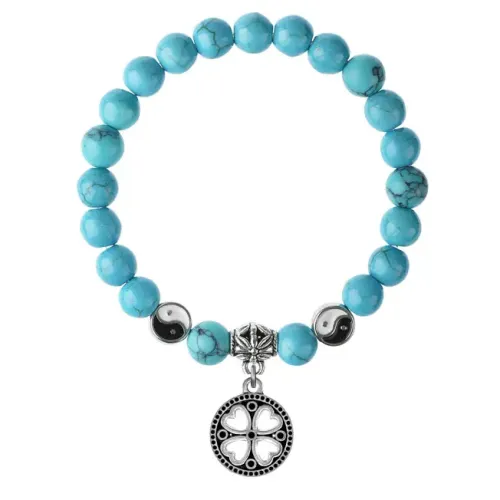 Браслет из синтетической бирюзы с подвеской-талисманом в виде клевера.