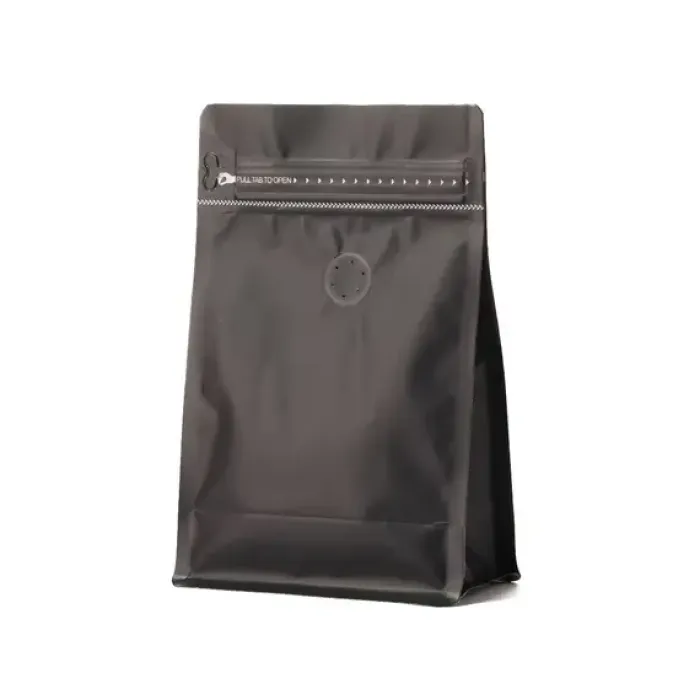 Пакет изготовлен из прочного пластика, что способствует увеличению срока хранения кофе. Конструкция включает встроенный односторонний клапан дегазации, который выпускает газ, но не пропускает внутрь воздух и влагу. Зип-застёжка позволяет многократно открывать и закрывать пакет, сохраняя его герметичные свойства.