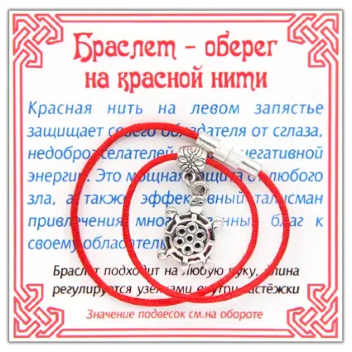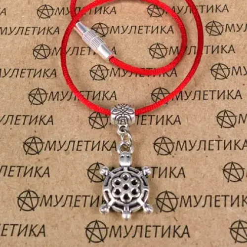 Материал и изготовление: Красная шелковая нить с закручивающимся замком. Металлическая подвеска в форме черепахи.