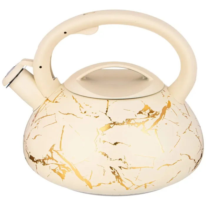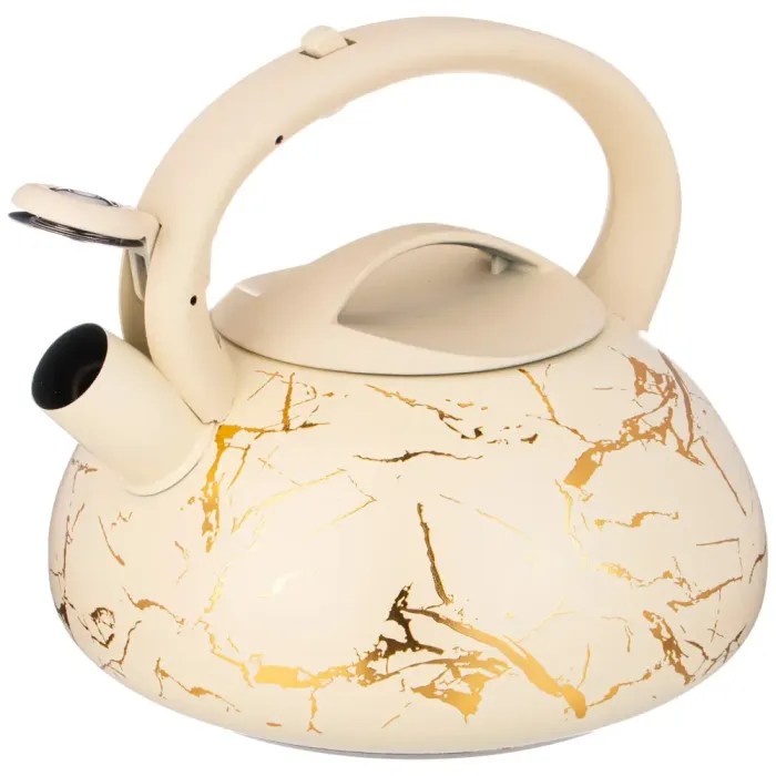 Корпус чайника выполнен из нержавеющей стали, устойчивой к коррозии. Индукционное капсульное дно обеспечивает совместимость со всеми типами плит, включая индукционные, и способствует равномерному нагреву. Конструкция включает ненагревающуюся ручку с клапаном для наливания и внешнее жаропрочное покрытие с матовой основой и глянцевым рисунком.