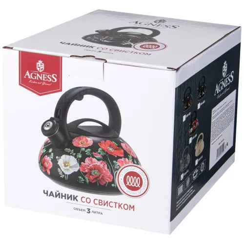 Чайник со свистком серии Fantasy от Agness объёмом 3 литра предназначен для кипячения воды. Изготовлен из нержавеющей стали, что обеспечивает прочность и гигиеничность. Ключевыми особенностями являются индукционное капсульное дно и наличие сигнального свистка.