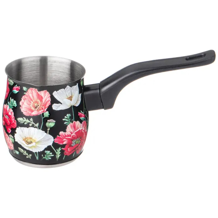 Конструкция турки предусматривает эргономичную ручку, которая не нагревается в процессе использования. Это позволяет комфортно пользоваться изделием без прихваток. Эксклюзивное покрытие с комбинацией матового чёрного фона и яркого рисунка придаёт модели стильный вид. Турку рекомендуется мыть вручную, чтобы сохранить её внешний вид и функциональность.