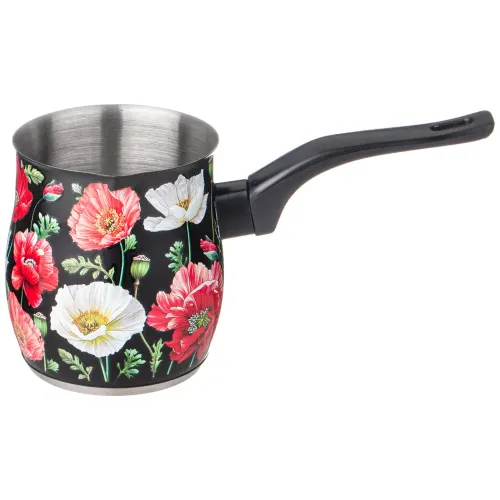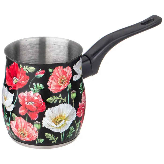 Турка серии Маки от Agness предназначена для приготовления ароматного кофе. Изготовлена из нержавеющей стали, которая не влияет на вкус напитка и отличается долговечностью. Особенность модели — уникальное покрытие с матовым чёрным фоном и ярким рисунком.