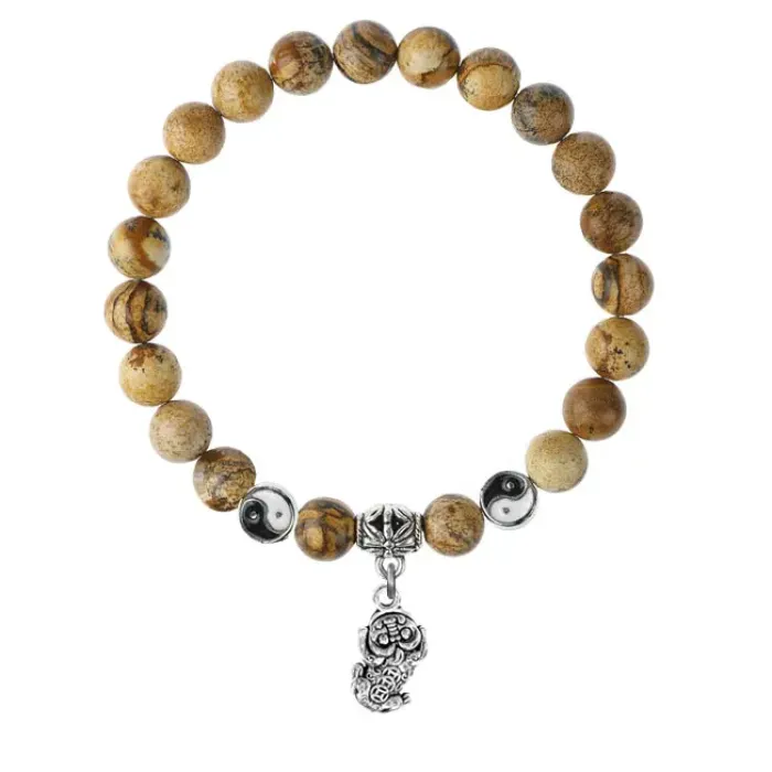 Браслет-амулет из натуральной песочной яшмы с подвеской Пи Яо из бижутерного сплава.