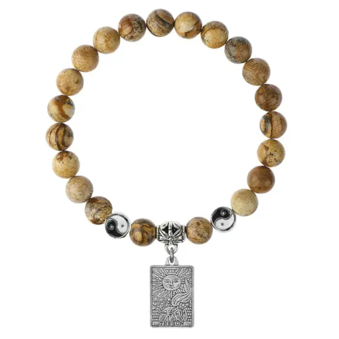 Браслет с подвеской в виде карты Таро «Солнце». Изготовлен из натуральной песочной яшмы и бижутерного сплава.