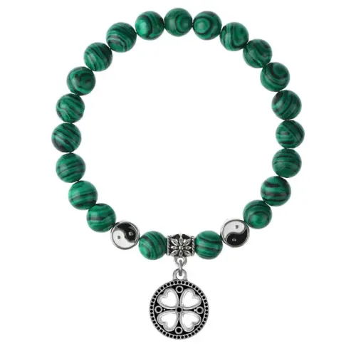 Браслет из синтетического малахита с подвеской-талисманом в виде клевера.