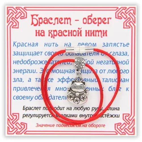 Браслет на красной нити Манеки-Неко — это не просто украшение, а мощный оберег, который традиционно используется для защиты от сглаза и порчи. Красная шелковая нить символизирует удачу и благополучие, а закручивающийся замок обеспечивает надежную фиксацию.