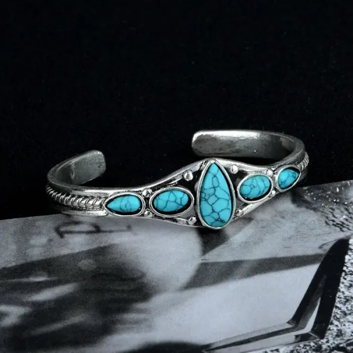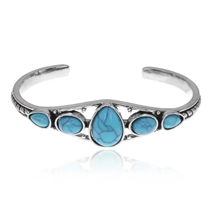 Безразмерный браслет для запястья из бижутерного сплава с вставками синтетической бирюзы и регулируемой посадкой.