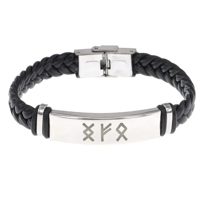 Кожаный рунический браслет с плетёной структурой и символами Ингуз, Феху и Одал.