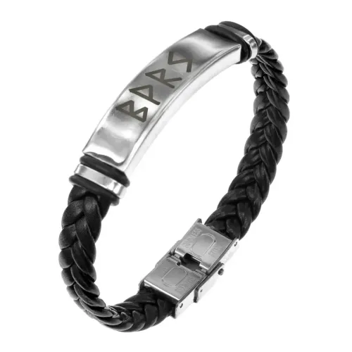 Материал и изготовление: Кожа, нержавеющая сталь. На браслет нанесена руническая формула, включающая символы Беркана, Вуньо, Райдо и Соулу.