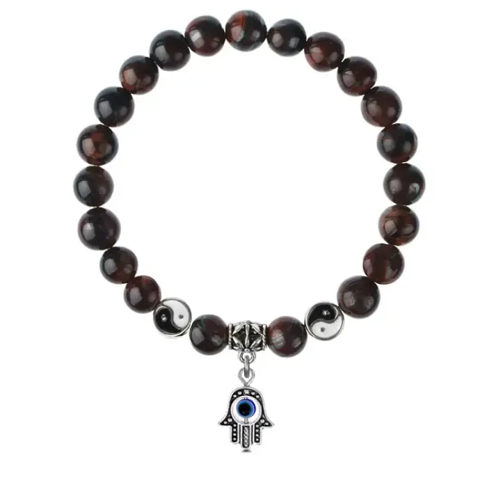 Браслет-амулет из натурального камня бычий глаз с подвеской в виде символа хамса.