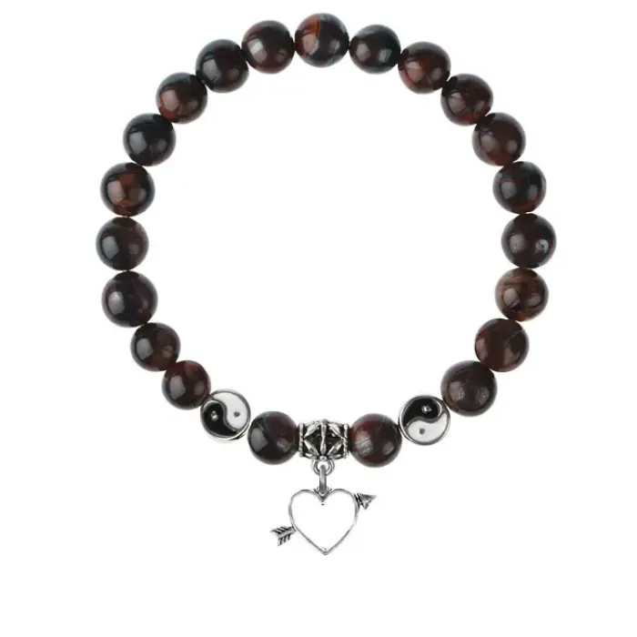 Браслет из натурального камня бычий глаз с подвеской в форме сердца из бижутерного сплава.