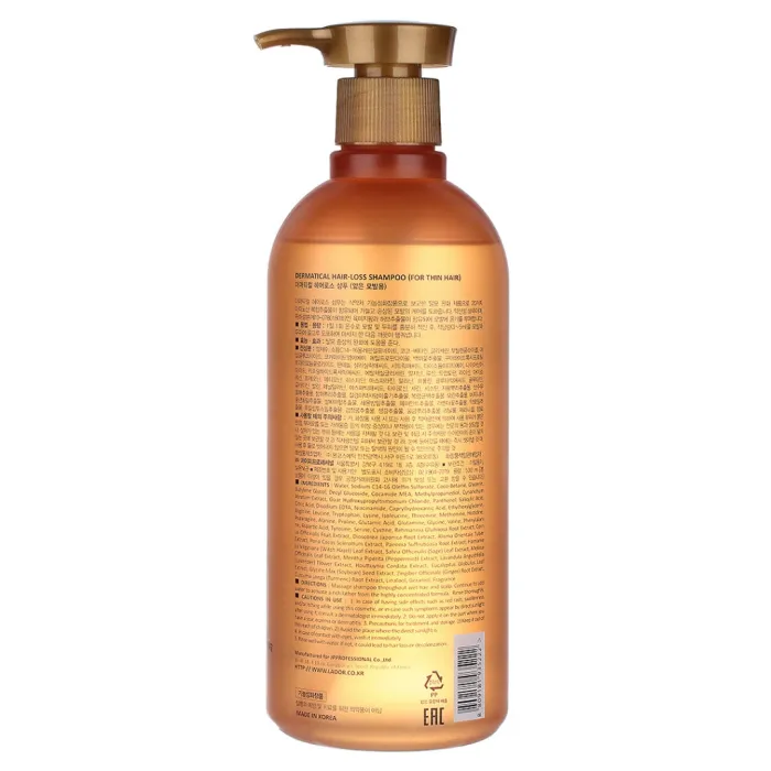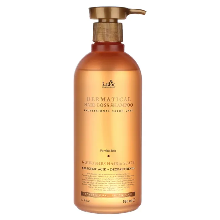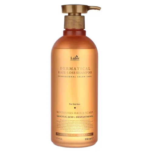 Шампунь DERMATICAL HAIR-LOSS SHAMPOO от корейского бренда Lador предназначен для ухода за тонкими и повреждёнными волосами. Формула шампуня включает 20 видов комплекса аминокислот, которые способствуют остановке выпадения волос и их восстановлению. В состав входят салициловая кислота, декспантенол и ниацинамид, которые помогают справиться с проблемой выпадения и истончения волос. Шампунь также обогащён 8 видами комплексных экстрактов трав, питающих и укрепляющих волосы, придавая им блеск и здоровье.