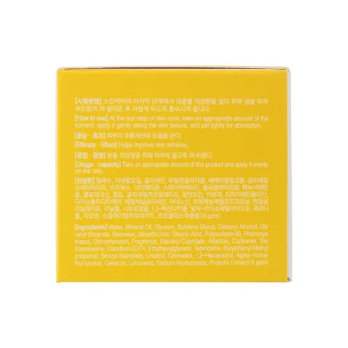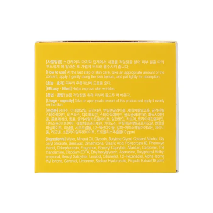 Состав: Water, Mineral Oil, Glycerin, Butylene Glycol, Cetearyl Alcohol, Glyceryl Stearate, Beeswax, Dimethicone, Stearic Acid, Polysorbate 60, Phenoxyethanol, Chlorphenesin, Fragrance (Butylphenyl Methylpropional), Glyceryl Caprylate (Caprylic/Capric Triglyceride), Allantoin (Soothing Agent), Carbomer (Thickener), Triethanolamine (pH Adjuster), Disodium EDTA (Chelating Agent), Ethylhexylglycerin (Preservative Enhancer), Adenosine (Anti-Aging Agent), Sodium Hyaluronate (Moisturizer), Propolis Extract.