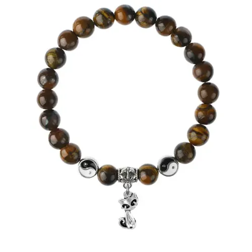 Браслет с подвеской в виде кошки. Изготовлен из натурального камня тигровый глаз и бижутерного сплава.