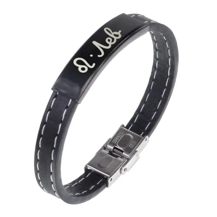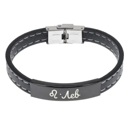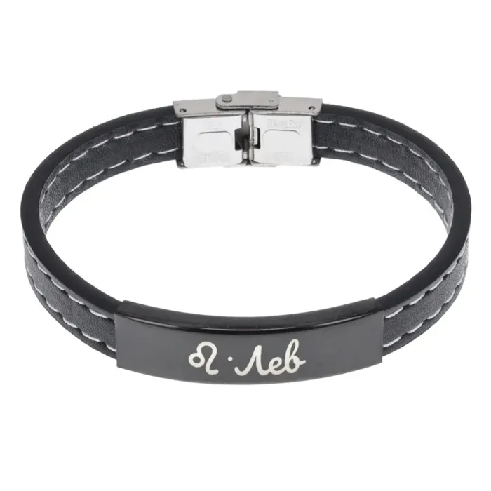 Кожаный браслет с гравировкой знака зодиака Лев. Изготовлен из кожи и нержавеющей стали.