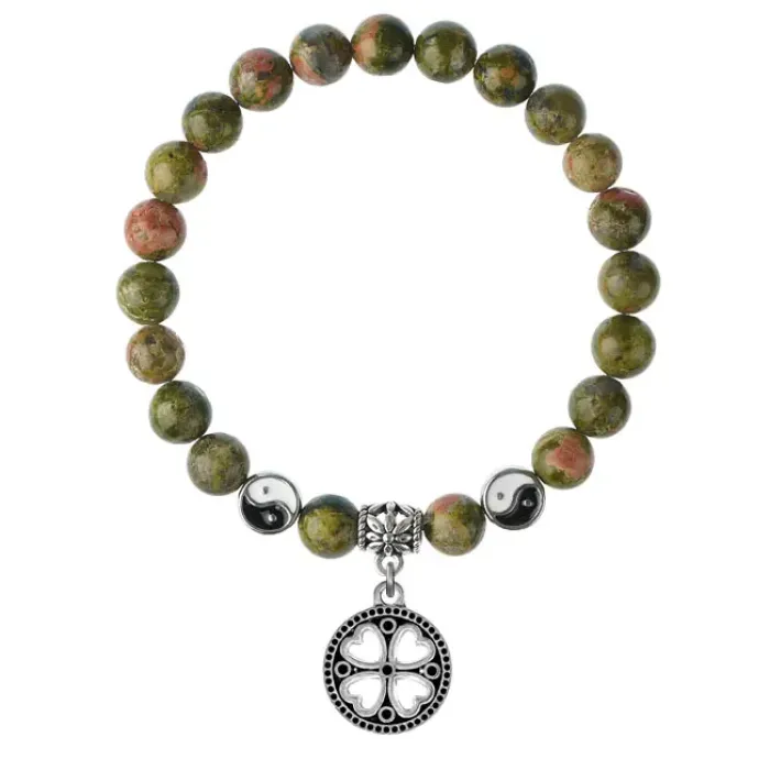 Браслет из натурального камня унакит с подвеской в виде клевера.