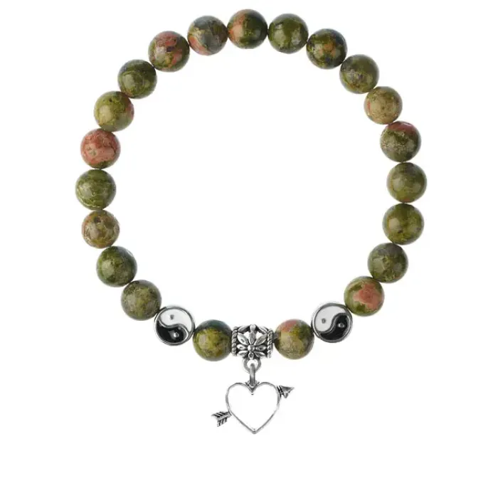 Браслет из натурального камня унакит с подвеской в форме сердца из бижутерного сплава.