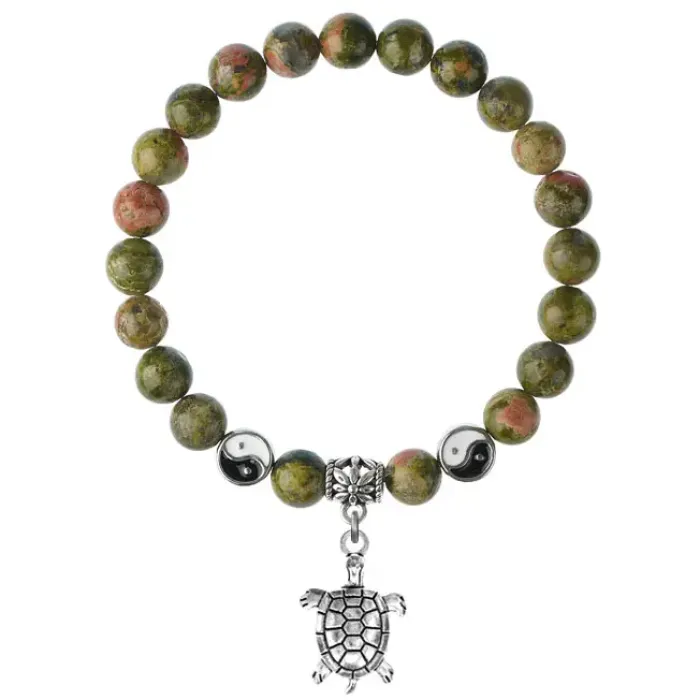 Браслет-амулет из натурального камня унакит с подвеской в виде черепахи.