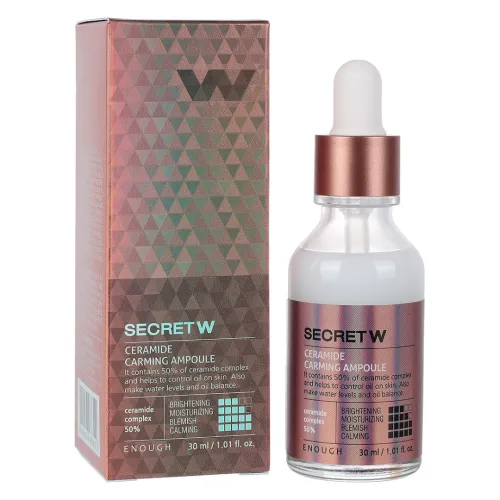 Ампульная эссенция для лица с керамидами Secret With ceramide carming ampoule от бренда Enough предназначена для ухода за чувствительной кожей. Содержит 50% комплекс керамидов, а также экстракты кактуса и соевых бобов, которые способствуют глубокому увлажнению и питанию кожи. Средство эффективно восстанавливает гидролипидный барьер, защищая кожу от воздействия внешних факторов.