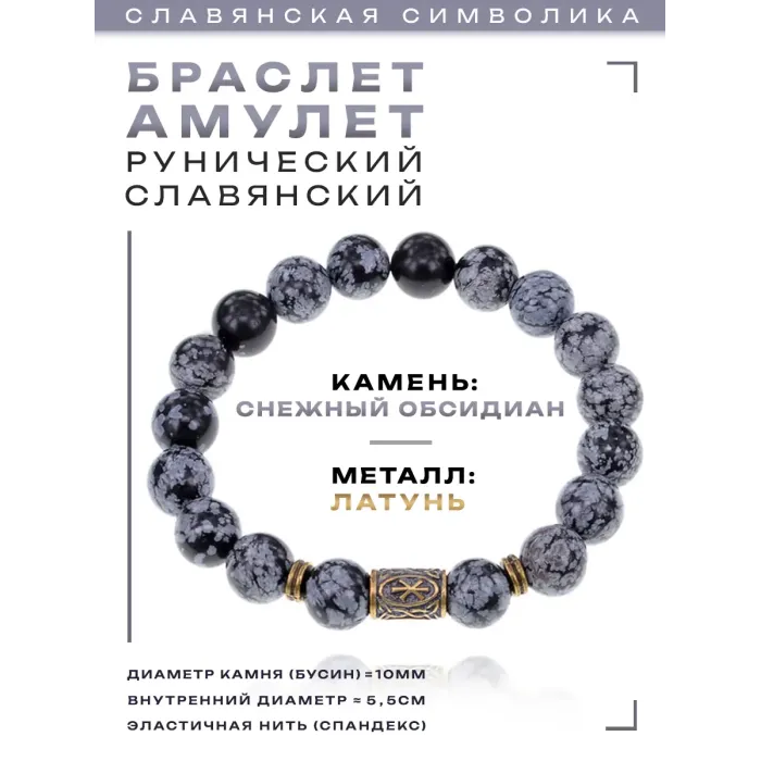 Браслет со славянской руной Рок и натуральным камнем Снежный обсидиан.