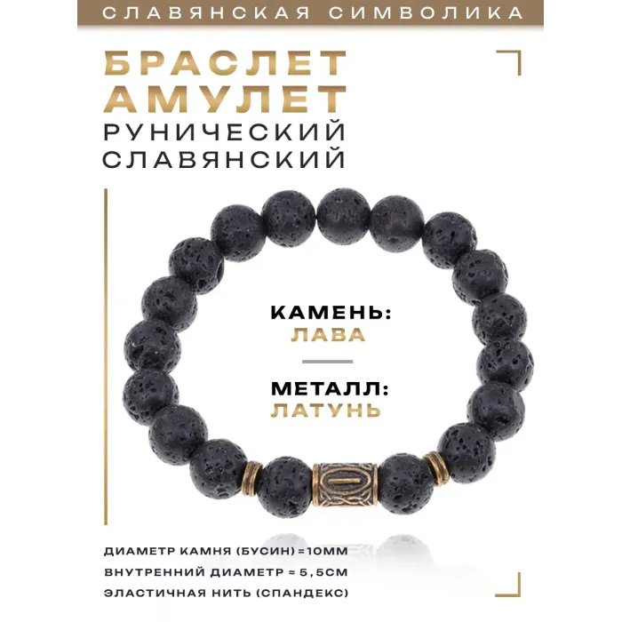 Браслет со славянской руной Исток и натуральным камнем лава диаметром 10 мм.