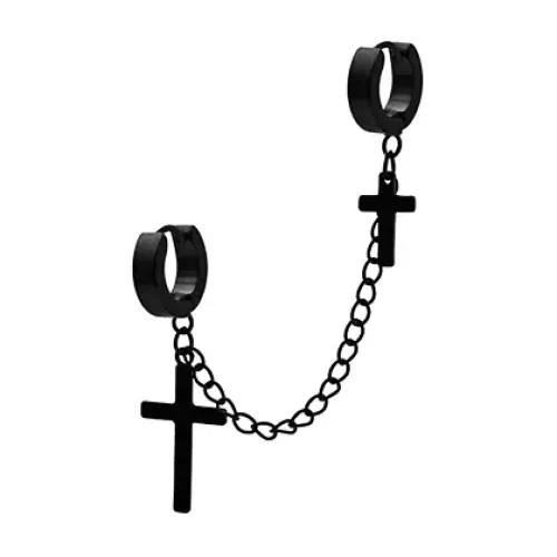 Серьга-каффа из нержавеющей стали и бижутерного сплава черного цвета с дизайном из двух крестов и цепочки.