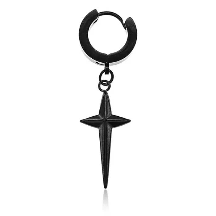 Серьга в виде четырёхконечной звезды из нержавеющей стали и бижутерного сплава чёрного цвета.