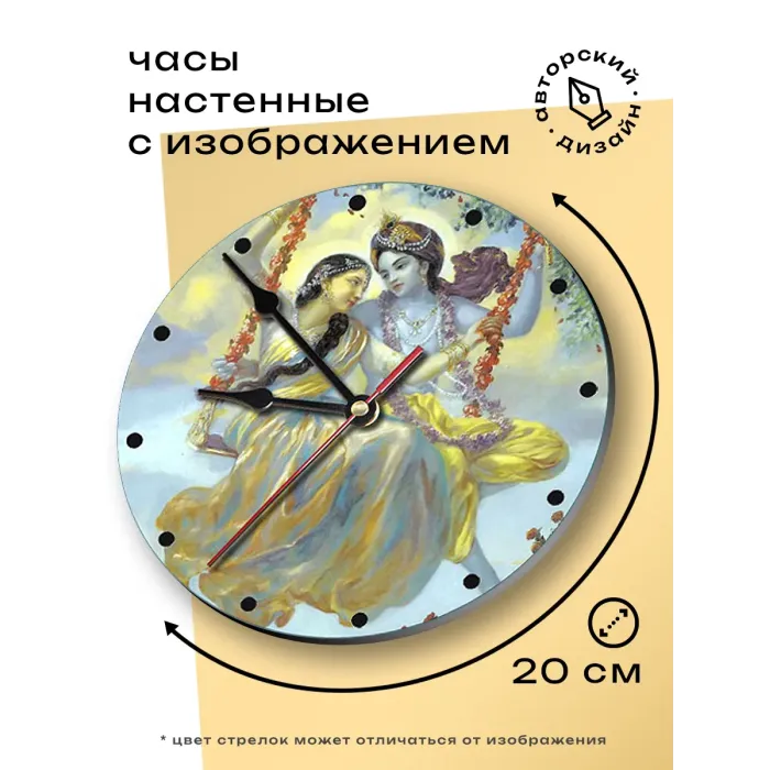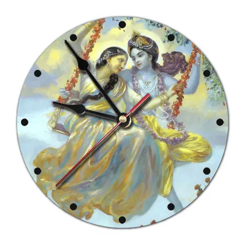 Настенные часы с изображением Кришны и Радхи. Изготовлены из вспененного пластика ПВХ, имеют открытый циферблат.