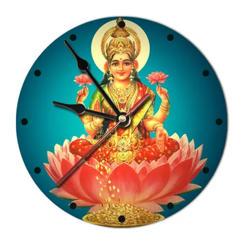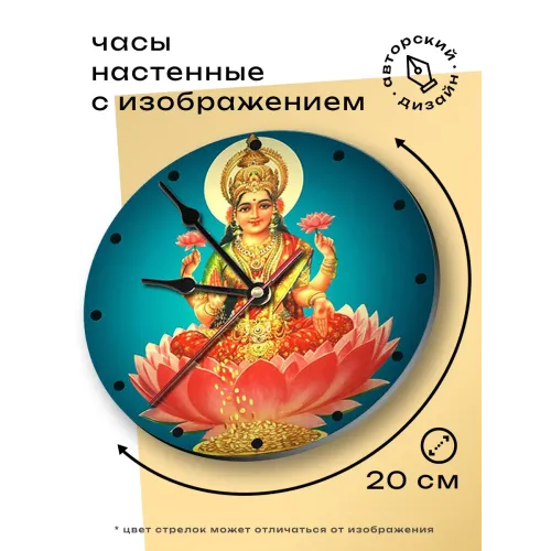 Настенные часы с изображением Лакшми. Материал — вспененный пластик ПВХ, дизайн с открытым циферблатом.