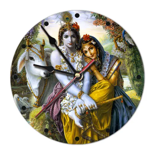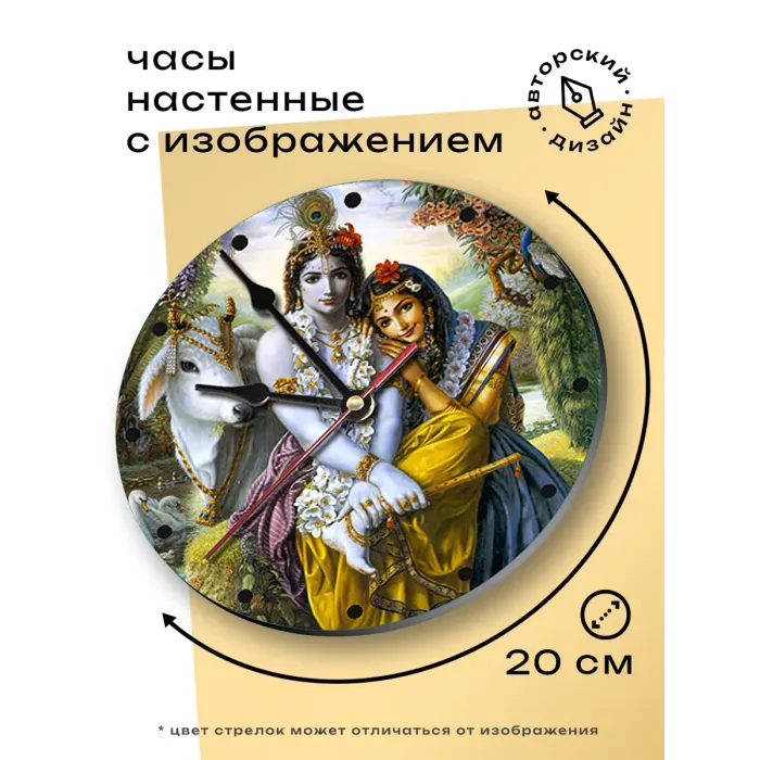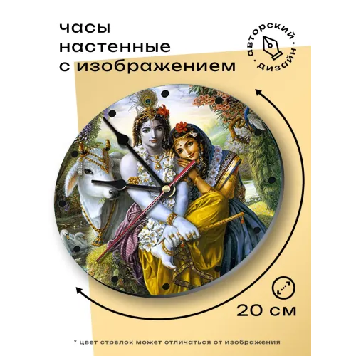 Настенные часы с изображением Кришны и Радхи. Круглые, диаметром 20 см, изготовлены из вспененного пластика ПВХ.