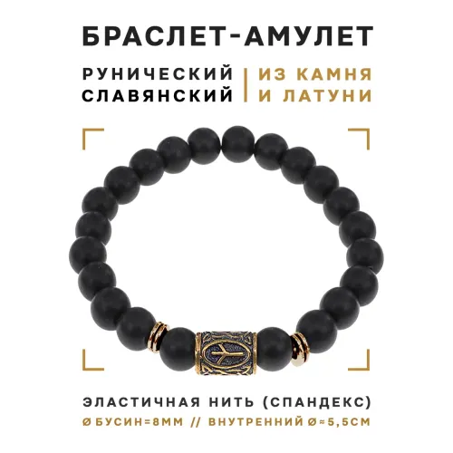 Браслет со славянской руной Мир и синт.камнем Шунгит, 8мм BSRN-01-24
