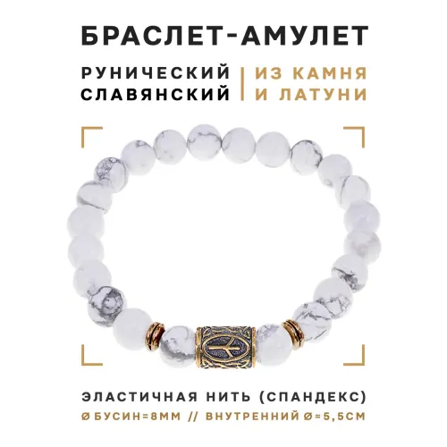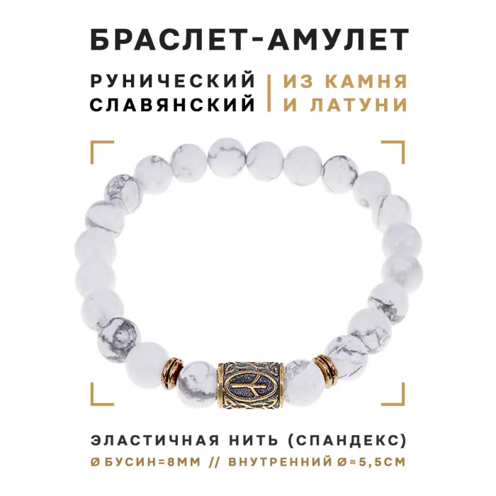 Браслет со славянской руной Чернобог и натуральным камнем кахолонг, диаметр бусин 8 мм.
