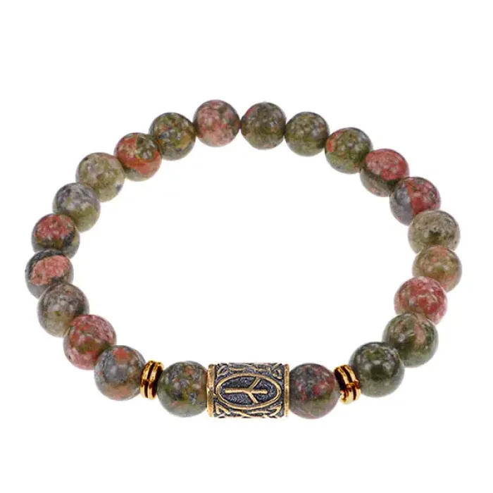 Браслет со славянской руной Чернобог и нат.камнем Унакит, 8мм BSRN-02-20