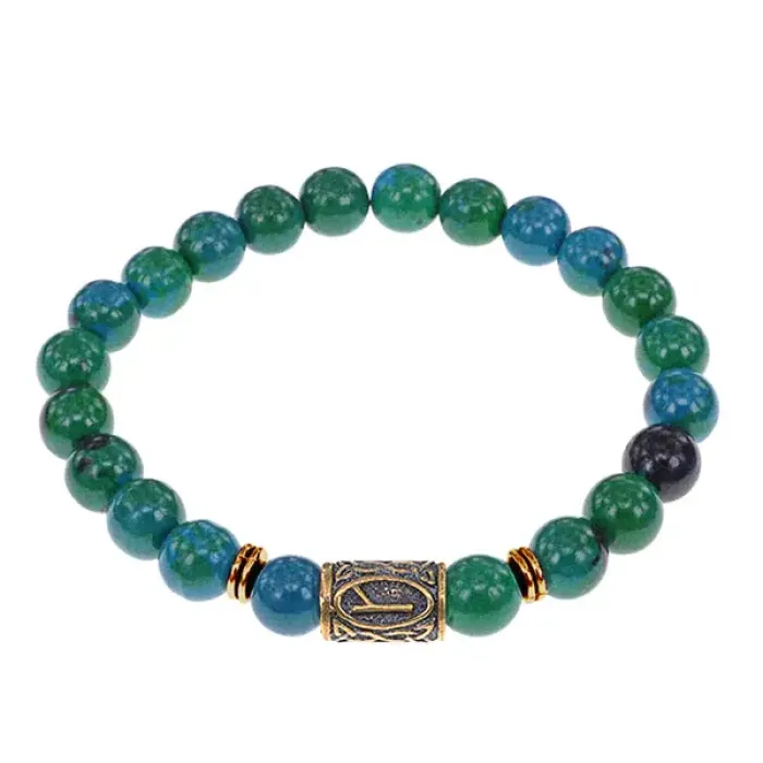 Браслет со славянской руной Алатырь и синт.камнем Хризоколла, 8мм BSRN-03-21