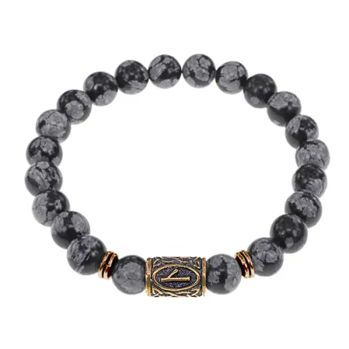 Браслет со славянской руной Нужда и нат.камнем Снежный обсидиан, 8мм BSRN-05-14