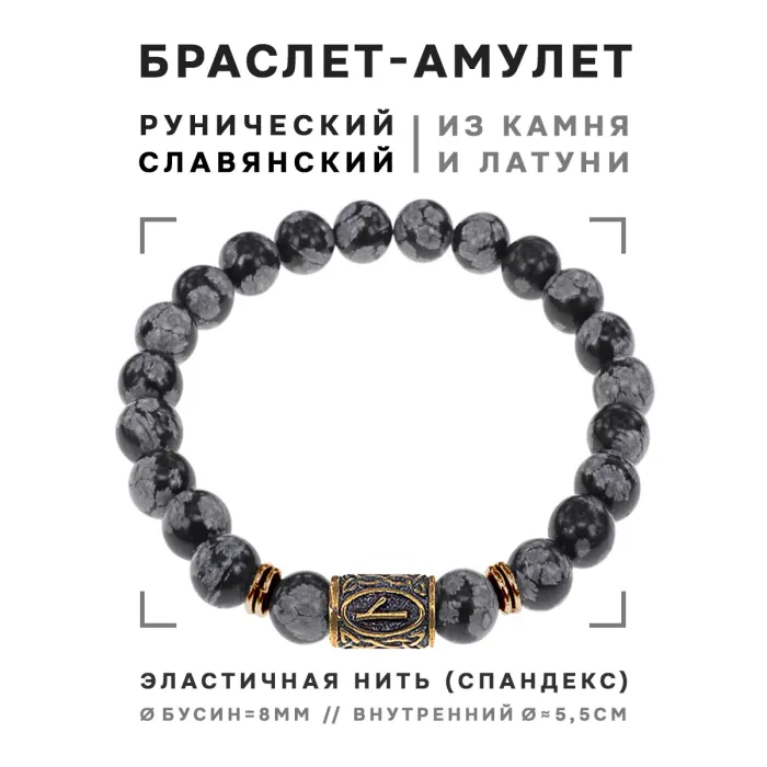 Славянский рунический браслет с натуральным камнем снежный обсидиан и бусинами диаметром 8 мм.