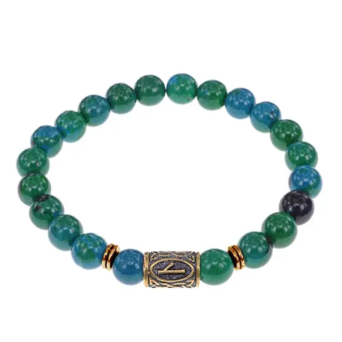 Браслет со славянской руной Нужда и синт.камнем Хризоколла, 8мм BSRN-05-21