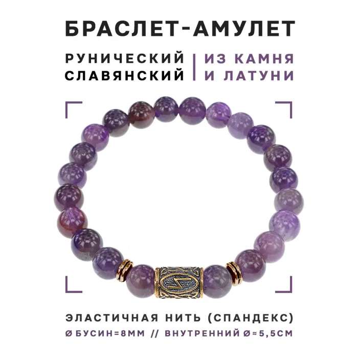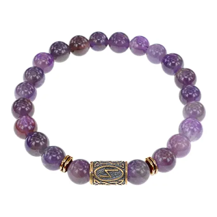 Браслет со славянской руной Сила и натуральным камнем Аметист, 8мм BSRN-08-03