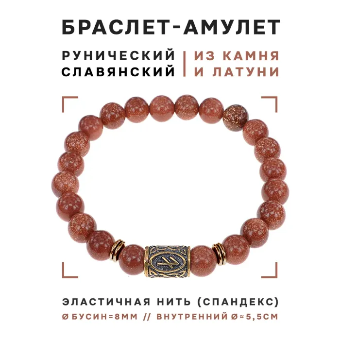 Браслет со славянской руной Берегиня и синт.камнем Коричневый авантюрин, 8мм BSRN-10-01