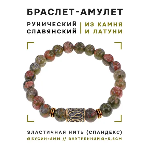 Браслет со славянской руной Уд и нат.камнем Унакит, 8мм BSRN-11-20
