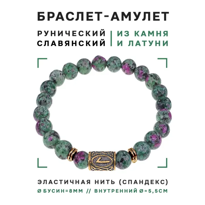 Браслет со славянской руной Леля и синт.камнем Цоизит, 8мм BSRN-12-22